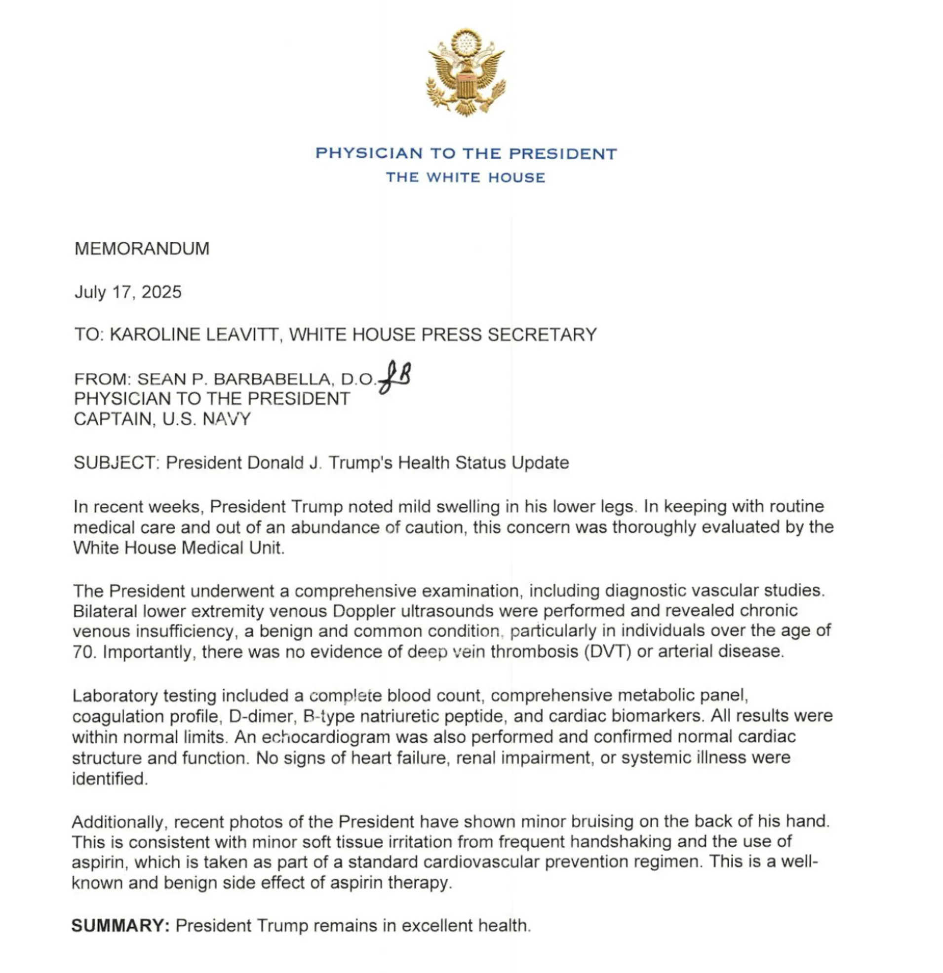 萊維特還補充說,特朗普的血液檢查結果都在“正常范圍內”,超聲心動圖證實“心臟結構和功能正常”,“沒有發現心力衰竭、腎功能障礙或全系統疾病的跡象”。