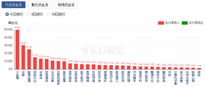 行業資金方面,截至收盤,小金屬、證券、能源金屬等凈流入排名靠前,其中小金屬凈流入49.81億。