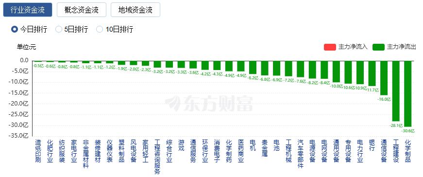 凈流出方面,化學制品、工程建設、通信設備等凈流出排名靠前,其中化學制品凈流出30.64億元。